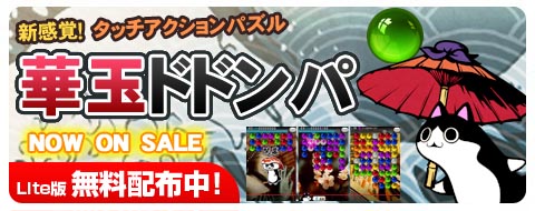縦と横に同じ色を3個以上並べると消える 「華玉」華玉にタッチしたままスライドす ると任意の場所に移動できます。簡単操作のアクションパズル。 それが「華玉ドドンパ」なのです。